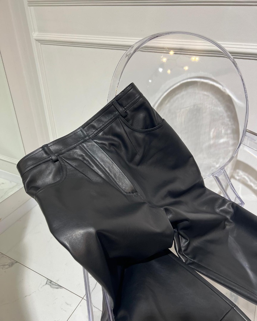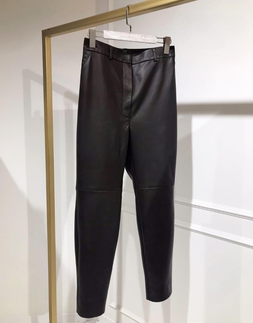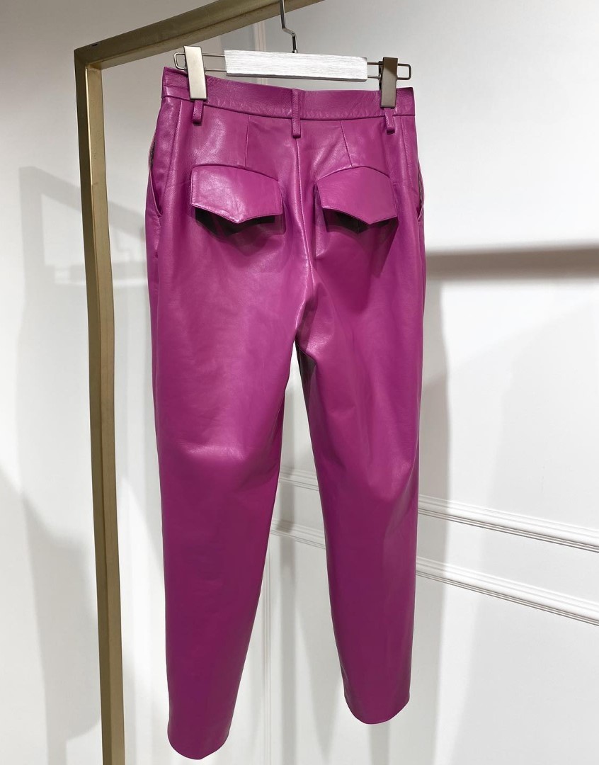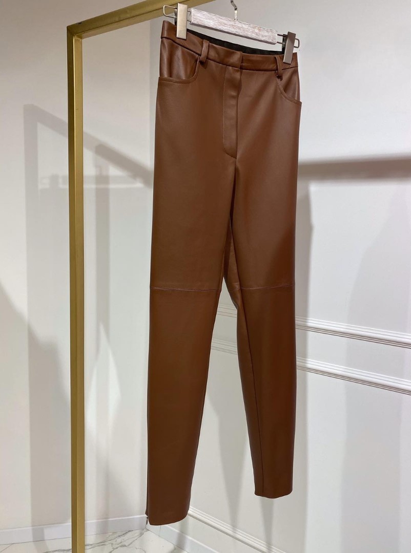 Пошив кожаных брюк выполняется из тонкой эластичной одежной кожи. Поверхность этого материала бывает матовая, гладкая или текстурированная. Цвета и оттенки в основном натуральные, природные. Но есть кожа приглушенного синего, красного, зеленого и других цветов. Кожаные вещи в ателье шьются обязательно с подкладкой, которая немного растягивается, например, стрейч-атлас. Благодаря подкладке брюки не натирают в процессе носки, а сам материал не деформируется.