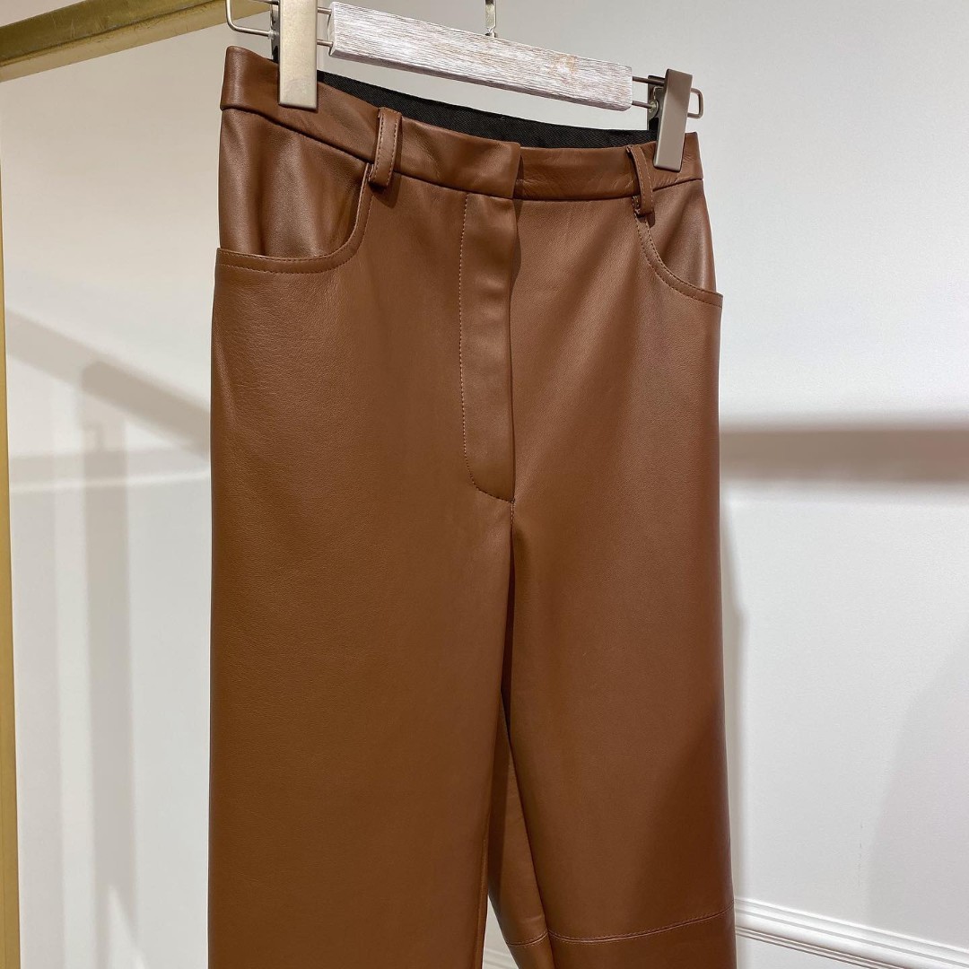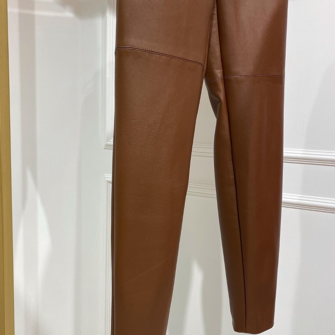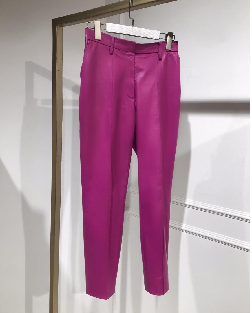 Пошив кожаных брюк выполняется из тонкой эластичной одежной кожи. Поверхность этого материала бывает матовая, гладкая или текстурированная. Цвета и оттенки в основном натуральные, природные. Но есть кожа приглушенного синего, красного, зеленого и других цветов. Кожаные вещи в ателье шьются обязательно с подкладкой, которая немного растягивается, например, стрейч-атлас. Благодаря подкладке брюки не натирают в процессе носки, а сам материал не деформируется.